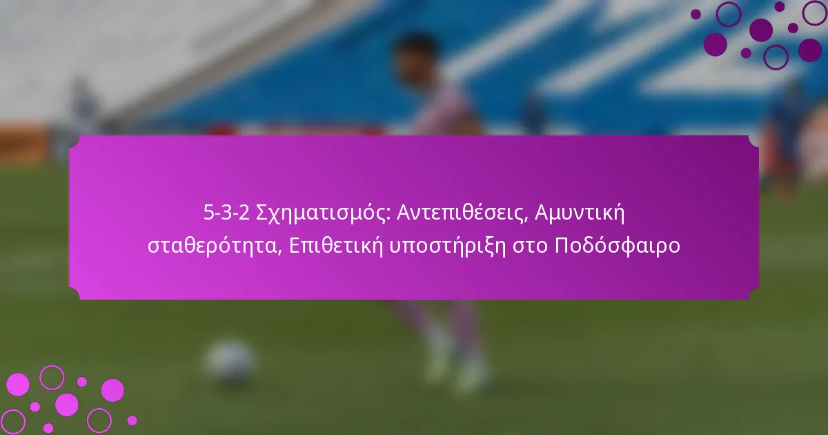 Η διάταξη 5-3-2 είναι μια τακτική προσέγγιση στο ποδόσφαιρο που περιλαμβάνει πέντε αμυντικούς, τρεις μέσους και δύο επιθετικούς, επιτυγχάνοντας μια ισορροπία μεταξύ αμυντικής δύναμης και επιθετικής ικανότητας. Αυτή η διάταξη όχι μόνο εξασφαλίζει μια σταθερή αμυντική γραμμή, αλλά διευκολύνει επίσης γρήγορες αντεπίθεσεις, επιτρέποντας στις ομάδες να εκμεταλλεύονται τα κενά που αφήνουν οι αντίπαλοι. Με την αξιοποίηση τριών κεντρικών αμυντικών, οι ομάδες μπορούν να διατηρήσουν μια συμπαγή δομή ενώ μεταβαίνουν γρήγορα στην επίθεση όταν προκύπτουν ευκαιρίες.